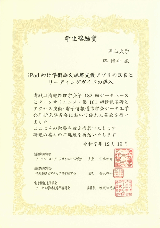 堺さんが冬のDBS/IFAT/DE合同研究会2025で発表し、学生奨励賞を受賞しました 投稿日: 2025年12月22日2026年1月9日 投稿者: ohtalab M2の堺さんが冬のDBS/IFAT/DE合同研究会2025で発表し、学生奨励賞を受賞しました。 学会詳細学会名: 冬のDBS/IFAT/DE合同研究会2025開催地: 奈良先端科学技術大学院大学(奈良県生駒市)開催期間:2025年12月19日(ハイブリッド発表) 発表詳細 著者 :堺陸斗, 金澤輝一, 上野史, 太田学発表題目:iPad向け学術論文読解支援アプリの改良とリーディングガイドの導入